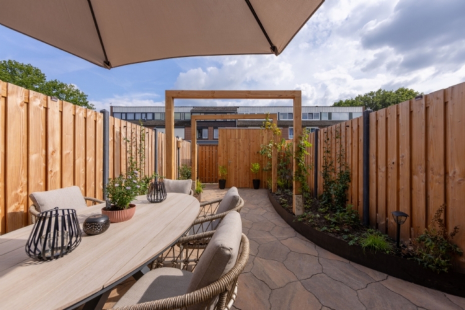 In dit ontwerp speelt bestrating een duidelijke hoofdrol. De warme tinten en organische vormen trekken de aandacht, maar blijven in balans met de rest van de tuin. Borders, beplanting en tuinmeubels zijn bewust rustig gehouden in kleur en materiaal. Daardoor krijgt de bestrating ruimte om het karakter van de tuin te bepalen, zonder te overheersen.