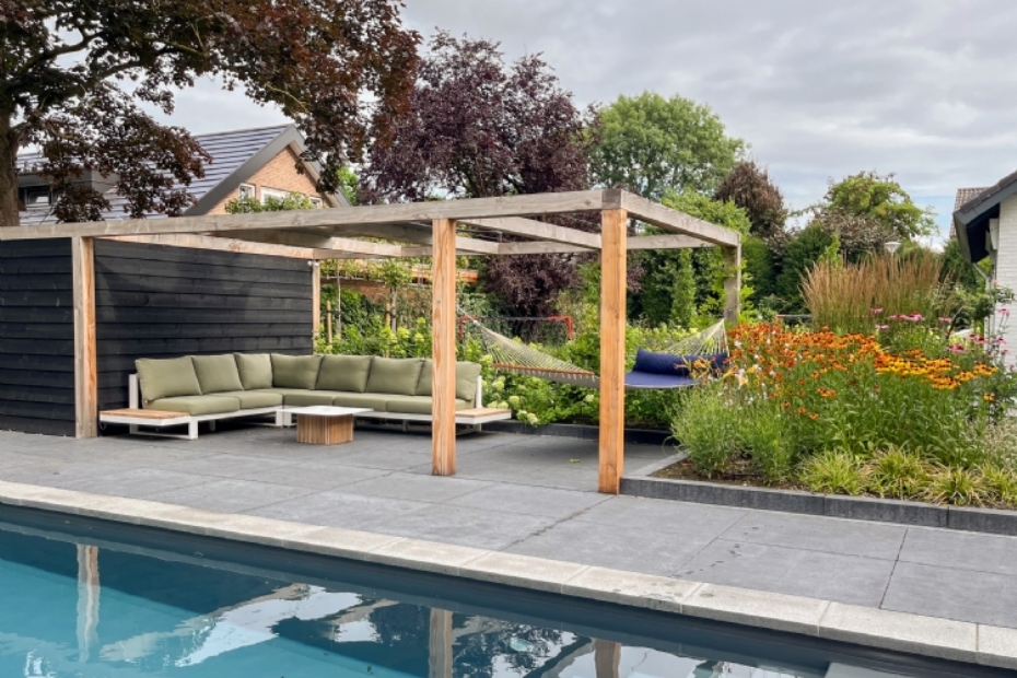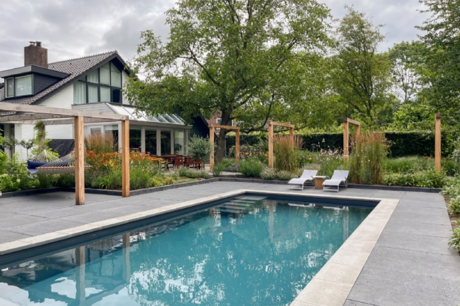 Blikvanger in de tuin is de volwassen notenboom, die een belangrijke rol speelt in de structuur en sfeer van de tuin. Centraal in het ontwerp ligt het zwembad. Dit element bepaalt niet alleen het gebruik van de tuin, maar ook de inrichting eromheen. Bij de keuze voor het type zwembad is nadrukkelijk rekening gehouden met veiligheid, onder meer in verband met jonge kinderen. Het zwembad is zo ingepast dat het logisch onderdeel uitmaakt van het geheel en geen losstaand object vormt.