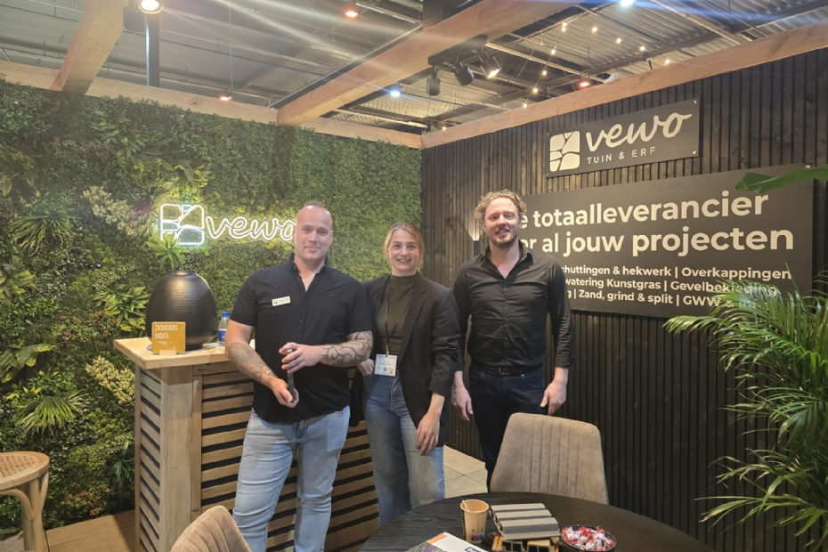 Maikel Mol, Linn van Dijk en Dennis Veltink staan bij VEWO Tuin & Erf op de stand. VEWO is totaal leverancier voor alle hovenierssprojecten. Tenminste.... voor alle niet levende materiaal in de tuin. De trend is de verdere beleving van binnen naar buiten, tuin als verlengstuk van de woomkamer en keuken.