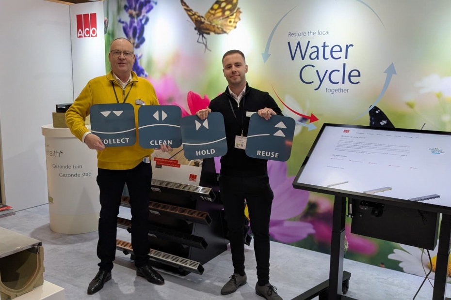 Jordi van den Berg en Pascal Derksen van ACO Nederland zijn er dit jaar ook. Met ACO staan ze op de beurs om watermanagement oplossingen te presenteren. Was het vroeger opvangen en afvoeren wat de klok sloeg, is het opslaan van water nu de norm.