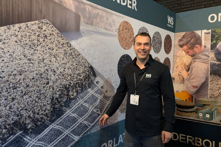 Frank van Leeuwen van WS Products laat op de stand de werking van hars gebonden grond zien. Bezoekers kunnen het product aanraken en testen. Ook zijn er stalen te zien van verschillende kleuren. 'Ik vind het belangrijk om te blijven vernieuwen en niet elk jaar hetzelfde te laten zien. Dat valt niet altijd mee, maar ik probeer steeds wat anders te laten zien. Ik merk dat er veel interesse is in hars gebonden grond. Het is in Nederland een nieuw product en dat trekt de aandacht.'