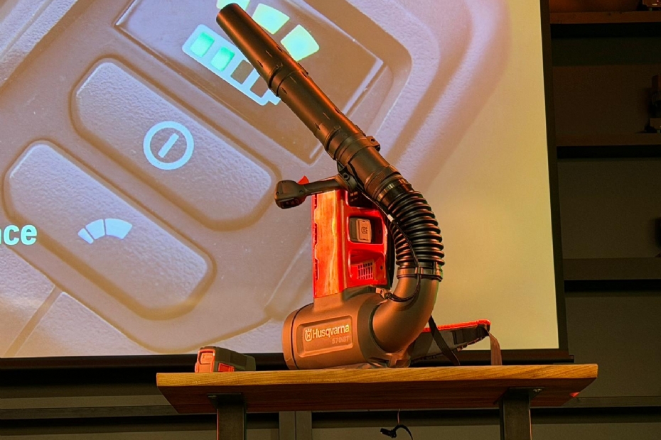 Husqvarna kwam in De Loods met een Europese primeur: een rug gedragen bladblazer, die de nieuwe standaard in de industrie belooft te worden. Zowel op het gebied van blaaskracht als capaciteit zou de nieuwe blazer tot de absolute top behoren. Compleet met drie accu's kun je 30 minuten op volle kracht werken.