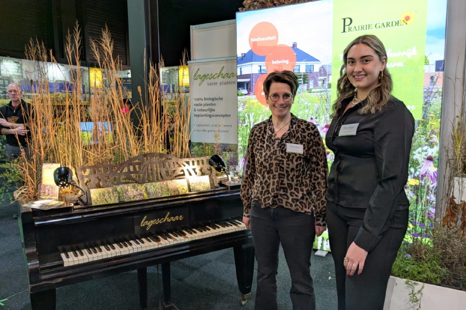 Lageschaar vaste planten presenteert het beplantingsconcept Wildissimo. Dit concept combineert inheemse planten met reguliere soorten. Judith Huinink en Noortje Klijnsma bemensen met hun collega's de stand. 'Het loopt goed door en we merken dat er veel interesse is in het nieuwe concept,' zegt Noortje. 'Deze beurs is ook een goede plek om contacten op te doen en de band met bestaande relaties aan te halen.'