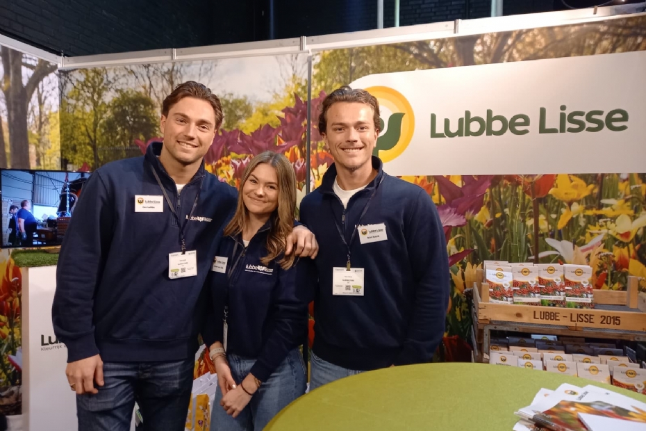 Lubbe Lisse, (v.l.n.r.) Cas Lubbe, Amber van Dijk en Rick Blonk: 'Voor ons is het het eerste jaar op deze beurs. Er is onder gemeenten, aannemers en hoveniers steeds meer belangstelling voor biologische bloembollen, vaste kruidenmatten voor de wadi en oevers. Het is makkelijk aan te leggen en het zijn onderhoudsarme concepten.'
