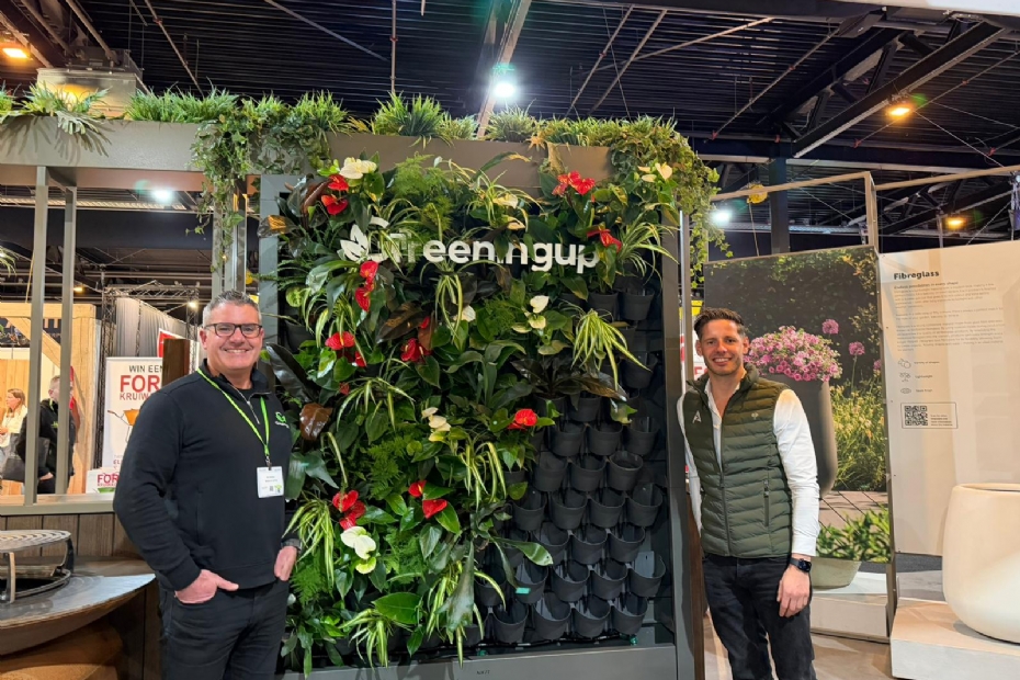 Rob Geene van ADEZZ (r) en Rick McKeever tonen samen een nieuw concept voor het in- en outdoor begroenen van gevels en wanden. Het systeem is tien jaar geleden ontwikkeld door het bedrijf van McKeever: Greeningup in de UK. Adezz heeft het systeem naar Nederland gehaald en wil het in de markt zetten via het Adezz netwerk. Het systeem is voorzien van automatisch irrigatie. Planten krijgen op die manier ook voldoende meststoffen.