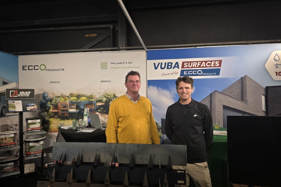 Edwin de Groot en Helle van Buuren van ECCO Products. In 2025 zijn ze de exclusieve verdeler voor Europa van VUBA surfaces. Dat is een een steentapijt voor buiten. Steen, en toch 100% waterdoorlatend.