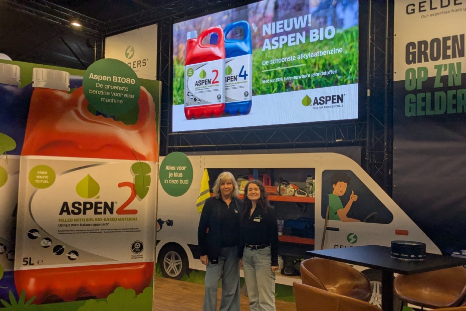 Bij Gelders treffen we o.a. Daisy Comhair (rechts). Gelders is prominent aanwezig op de beurs met de Aspen BIO. Dat is hun nieuwste alkylaatbenzine (ISCC-gecertificeerd) met tot wel 80% biobased grondstoffen. Aspen BIO werkt in 2-takt en 4-takt machines.