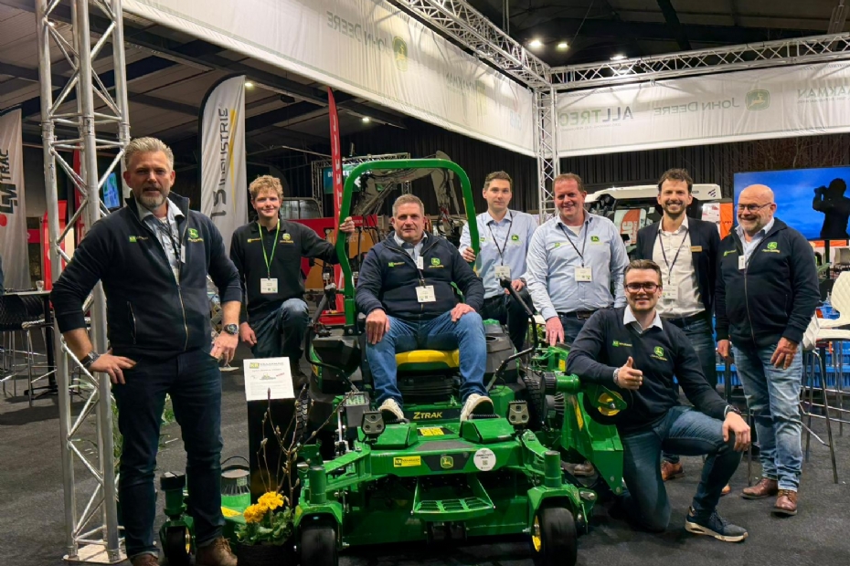 De totale bemanning van de Kraakman/John Deere stand op een John Deere zeroturn. Centraal op de stoel van de zeroturn Erik Jansen.