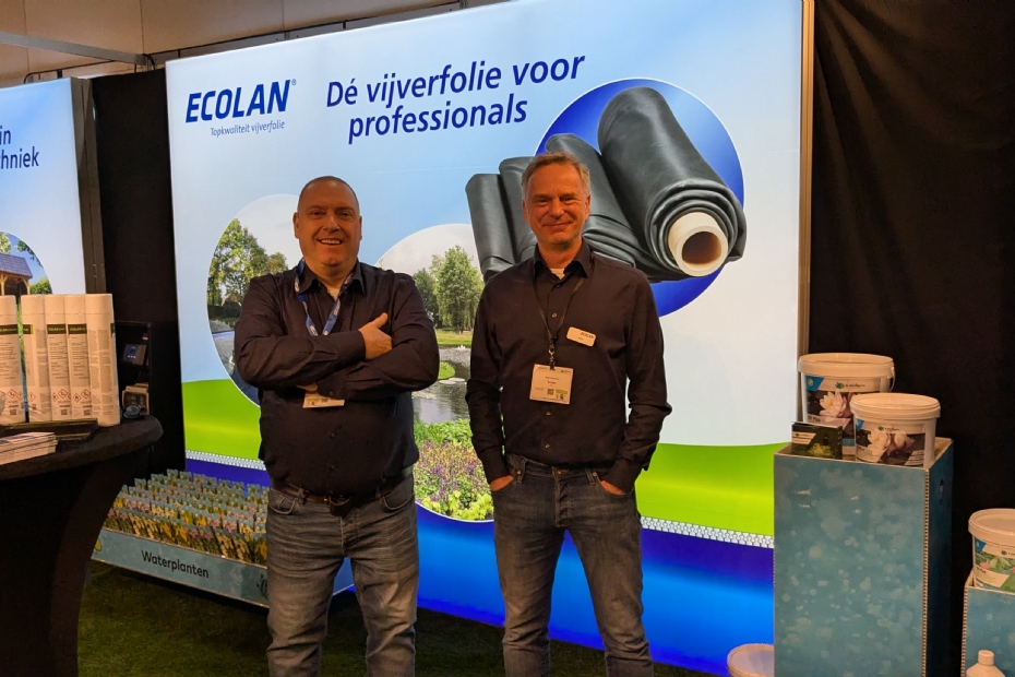 Bij Ecolan staan Remi Hoogland en Jack de Leeuw met EPDM vijverfolie op de beurs. Onder de vijver bouwers is ECOLAN EPDM vijverfolie al jaren synoniem voor topkwaliteit aldus beide heren.