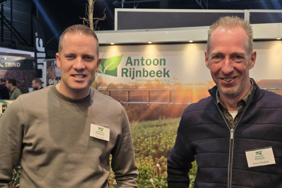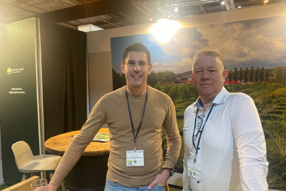 Marvin Kleijn en Antoon Rijnbeek van Antoon Rijnbeek Handelskwekerik zijn op de De Groene Sector Vakbeurs om de hovenier een uitgelezen assortiment te laten zien. Ze beloven ontzorging voor de hovenier tot op het project.