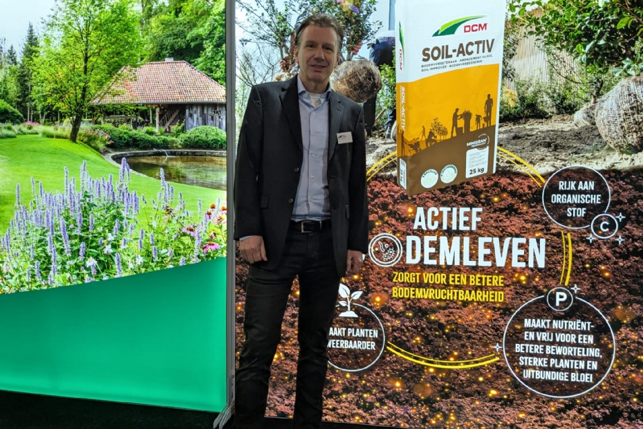 Aldert Engelsman van DCM brengt Soil-Activ onder de aandacht. Dit product moet de bodemvruchtbaarheid verhogen en planten weerbaarder maken. 'Dit product geeft planten een betere kans om te groeien en verhoogt een succesvolle aanleg of aanplanting. Zo ontstaat een snellere inworteling en wordt de bodem humusrijker en vruchtbaarder.'