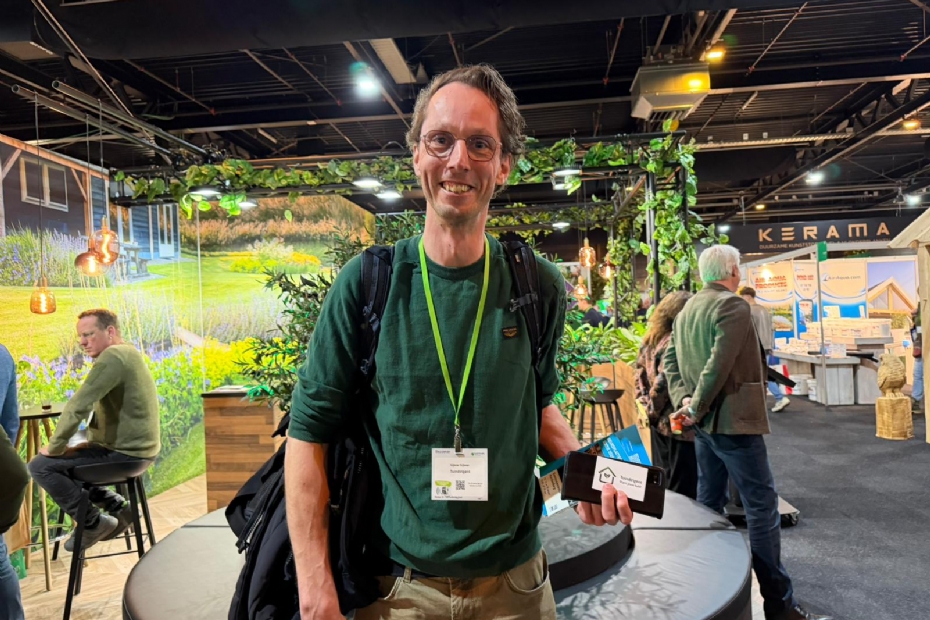 Dirk Jan Huttinga van Wellness Tuinier heeft een goede beurs: 'Het is lekker druk op de stand. We hebben veel ruimte over gelaten voor onze nieuwe trapindeling met een natuurstenen plage. Dat zorgt voor een meer natuurlijke uitstraling. Ook pakken we uit met onze waterbesparende fillertechniek waarmee je op jaarbasis wel 6000 liter water bespaart.'