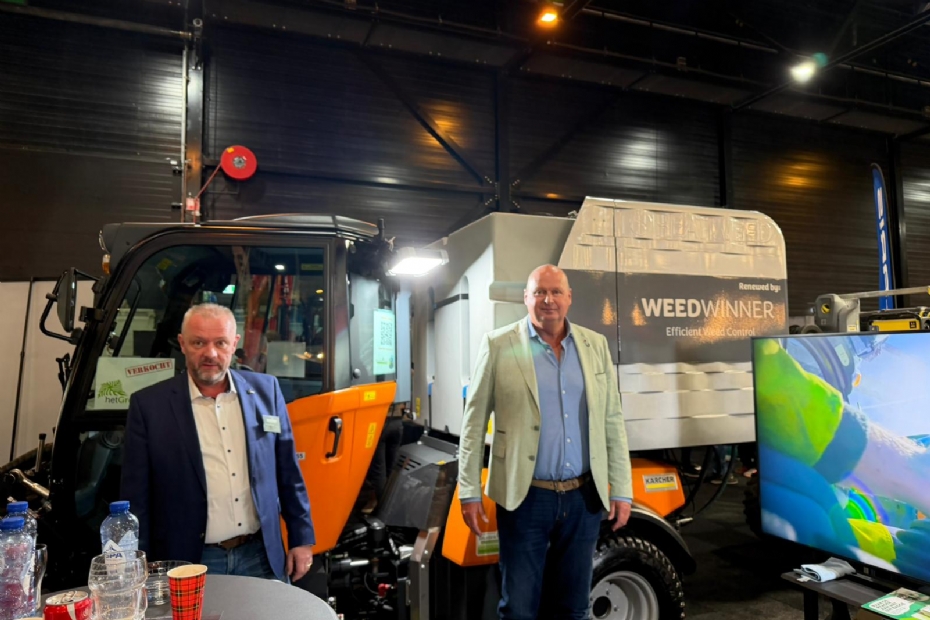 Op de stand van Kärcher staat de WeedWinner heet water onkruidmachine. Wie goed kijkt ziet dat het eigenlijk een refurbished WAVE Heatweed machine is die door het bedrijf DEM bv van Willem Hellinga i.s.m. Henk van de Haar is opgepakt. In het voorjaar worden compleet nieuwe machines beschikbaar onder de naam WEEDWINNER sensor 3.0 voor noordwest Europa.