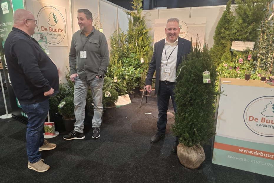 Benno Nieuwenhuis van Handelskwekerij De Buurte . Nieuwenhuis is nieuw bij De Buurte sinds 1 oktober 2025. De Buurte specialiseerd in groenblijvende haagplanten. Naast Nieuwenhuis op de foto de Taxus media rising star, een selectie die gevonden is op de eigen kwekerij, met een dichte en uniforme, rechtopgaande groei. Collega Henry Nooteboom (links) in gesprek met een hovenier.
