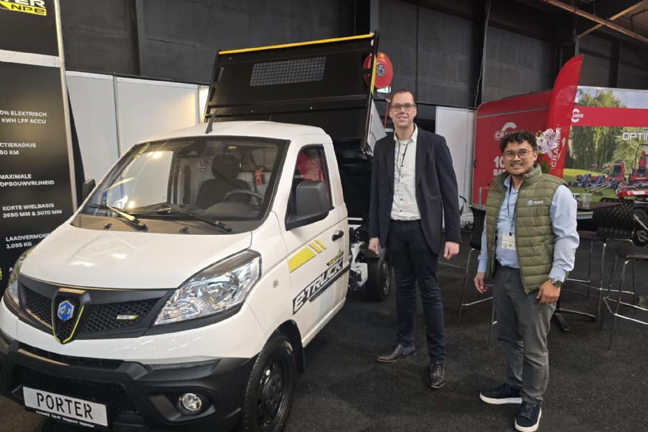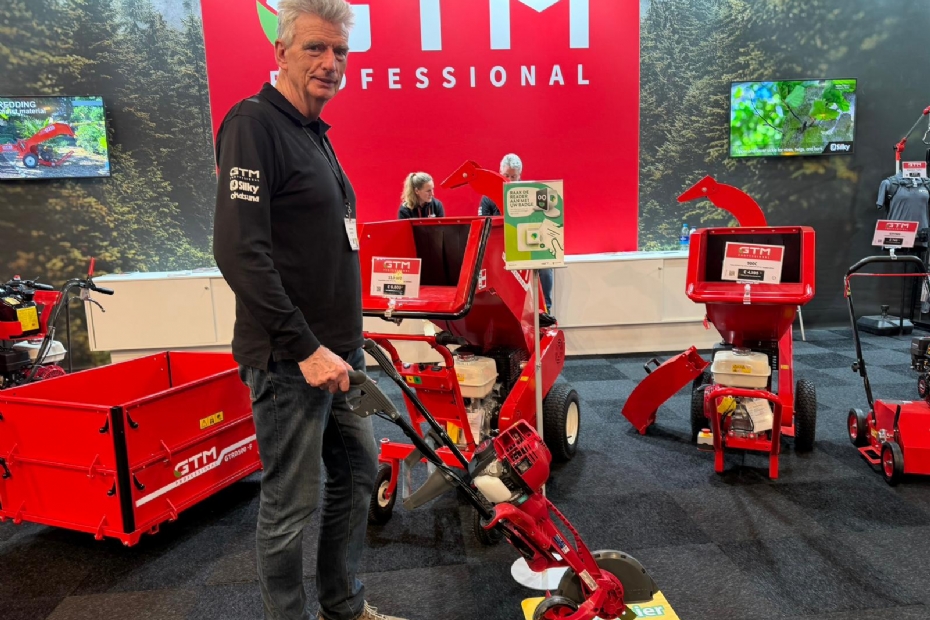 Arne van der Valk van Heybroek met de nieuwe Maredo cyclone bladblazer met een capaciteit van 150 kuub per minuut. Volledig electrisch en binnenkort start een demotour, maar de eerste blazers zijn al verkocht op de beurs.
