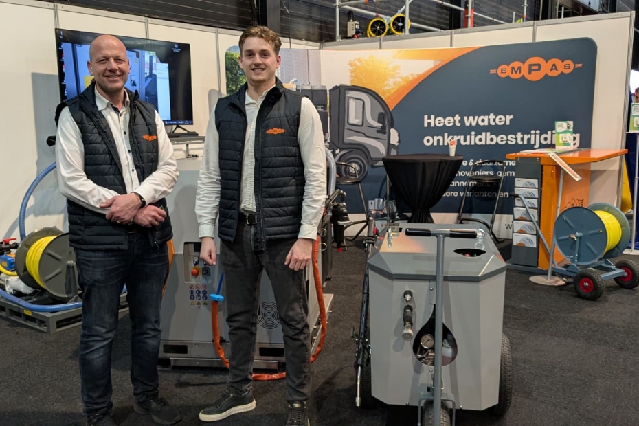 Bij Empas zien we Anton van de Vendel en Carel Doornenbal. Empass is sinds 1999 specialist op het gebied van onkruidbeheer op (half)verhardingen en openbare terreinen van sportvelden en campings. De machines zijn voorzien van innovatieve en milieuvriendelijke heetwater technieken.