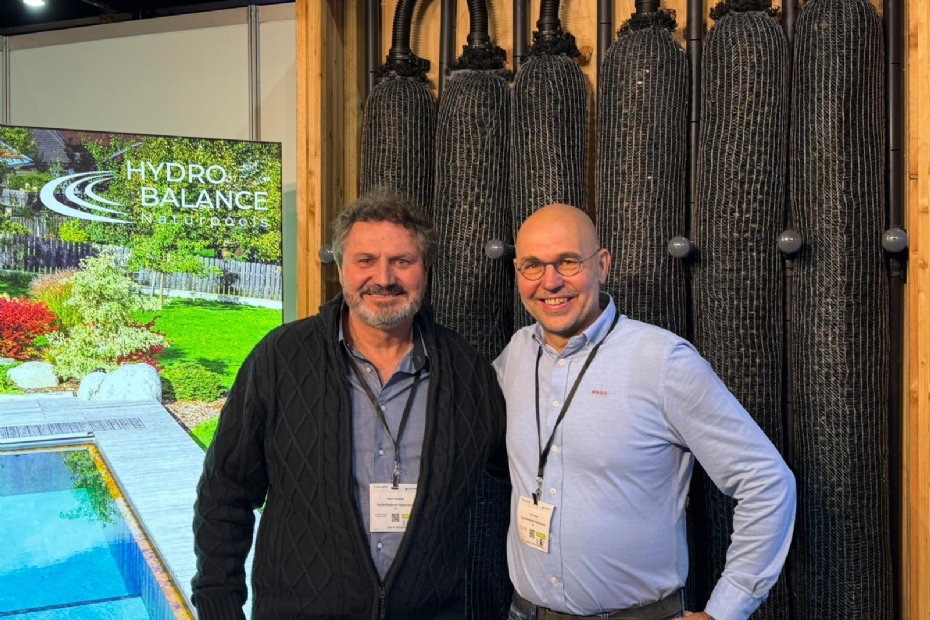 Hydro balance, v.l.n.r. Franz Kubacek en Teun Spies. Hydro Balance legt zelf geen natuurzwembaden aan, maar ondersteunt hoveniers met advies en de levering van materialen, en met name met een eigen lijn speciale filters. Deze filters werken niet met traditionele filtermaterialen zoals bijvoorbeeld lava, maar met filterelementen op basis van rockwool. Op de achtergrond is daarvan een voorbeeld te zien. Het grote voordeel van deze Hydro Balance-filters is dat op een relatief klein oppervlak een hoge filtercapaciteit kan worden gerealiseerd.