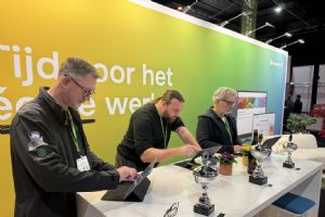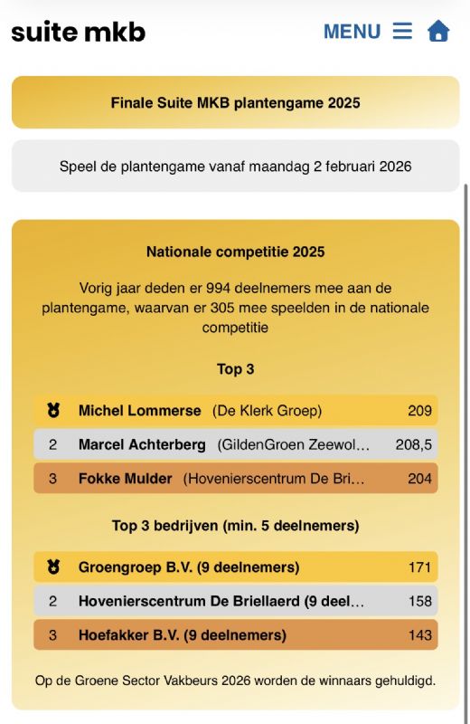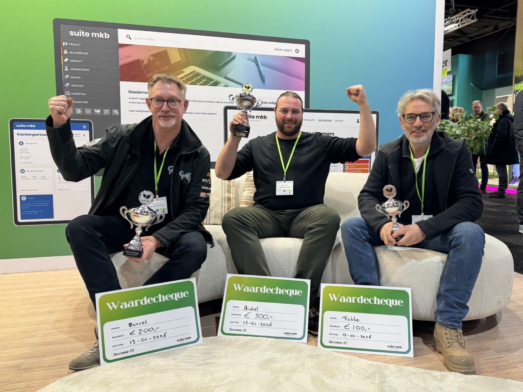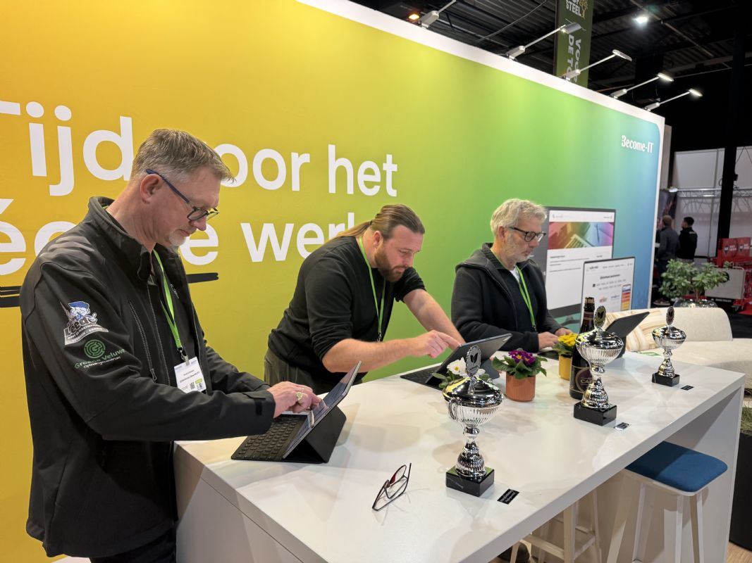 Tijdens de Groene Sector Vakbeurs in Hardenberg draaide het dinsdagmiddag op de stand van Become-IT even niet om relatiebeheer of de nieuwste software, maar om de finale van de Suite MKB Plantengame 2025. Drie hoveniers beantwoordden live vragen over planten, onder tijdsdruk en voor publiek. Michel Lommerse van Denayere Hoveniers maakte de minste fouten en ging met goud naar huis. Marcel Achterberg van GildenGroen Zeewolde eindigde als tweede en Fokke Mulder van Hovenierscentrum De Briellaerd werd derde. 'De vragen die dit spel stelt, houden je scherp.'