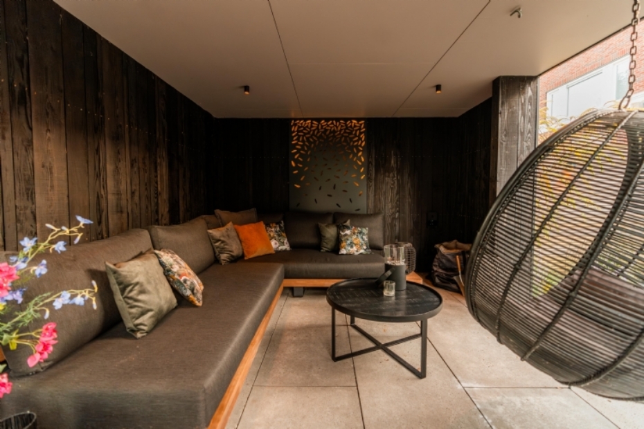 De erfafscheiding is uitgevoerd in thermisch gemodificeerd Ayous hout. De overkapping is gebouwd van zwart Douglas hout en aan de binnenzijde afgewerkt met een aluminium design wandpaneel van Adezz, dat van achteren is verlicht.
