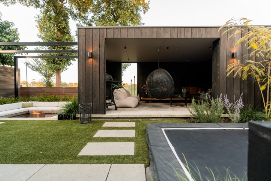 Ook aan gebruik door kinderen is gedacht. Een deel van de tuin is ingericht met kunstgras en een trampoline. De uitvoering is verzorgd door Vermeer Tuinen in samenwerking met Hoveniersbedrijf Elings. De foto's zijn gemaakt door Sourced Media.