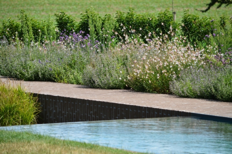 Biozwembad en aanvullende materialen Centraal in de tuin ligt het biozwembad met infinity-rand. De verharding rondom het zwembad zorgt voor een geleidelijke overgang tussen water en groen. Bij het bijgebouw is gekozen voor tegels in Chambolle Poco Vechio. Paden en overgangen zijn uitgevoerd in gestabiliseerd siergrind van Franse dolomiet, wat zorgt voor een lichtere uitstraling.