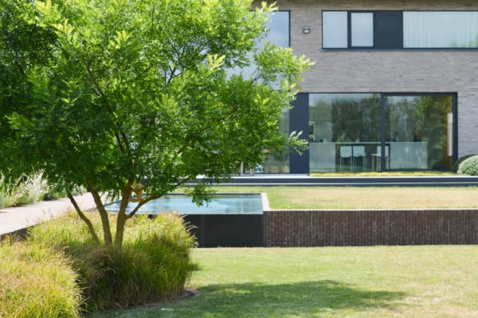 In een glooiend landschap is een particuliere tuin aangelegd met een duidelijke ruimtelijke opzet en een sterke relatie met de omgeving. In het project zijn straatbakstenen toegepast van Steenbakkerij Vande Moortel.
