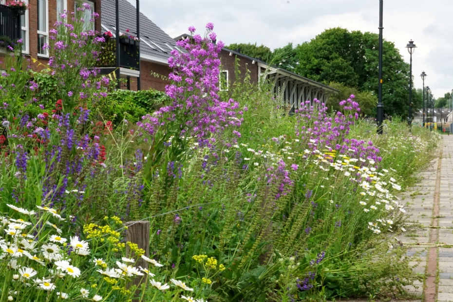 Een geslaagd voorbeeld van een Wildissimo-project is het Spoorpark in Goor, vertelt Terpstra. 'Door het ontwerp en de beplanting is de typische sfeer van het voormalige spoorterrein behouden en er valt het hele jaar iets te beleven qua bloei en structuur. Leuk detail is dat we hier de spoorbloem (Centranthus ruber) hebben toegepast: een plant die zich graag uitzaait, maar nooit te dominant wordt. De roodroze bloemen vormen een sterk kleuraccent tussen soorten die vooral wit, geel en blauw bloeien. Het is bovendien een belangrijke nectarplant voor de populaire kolibrievlinder.'