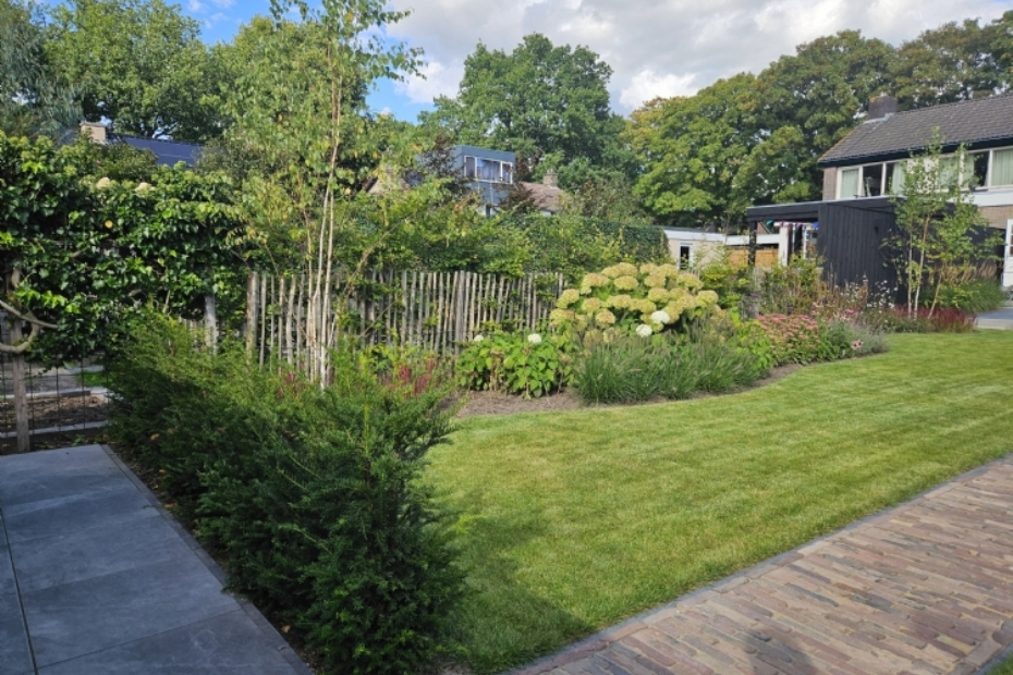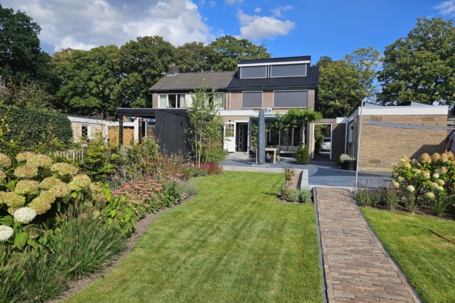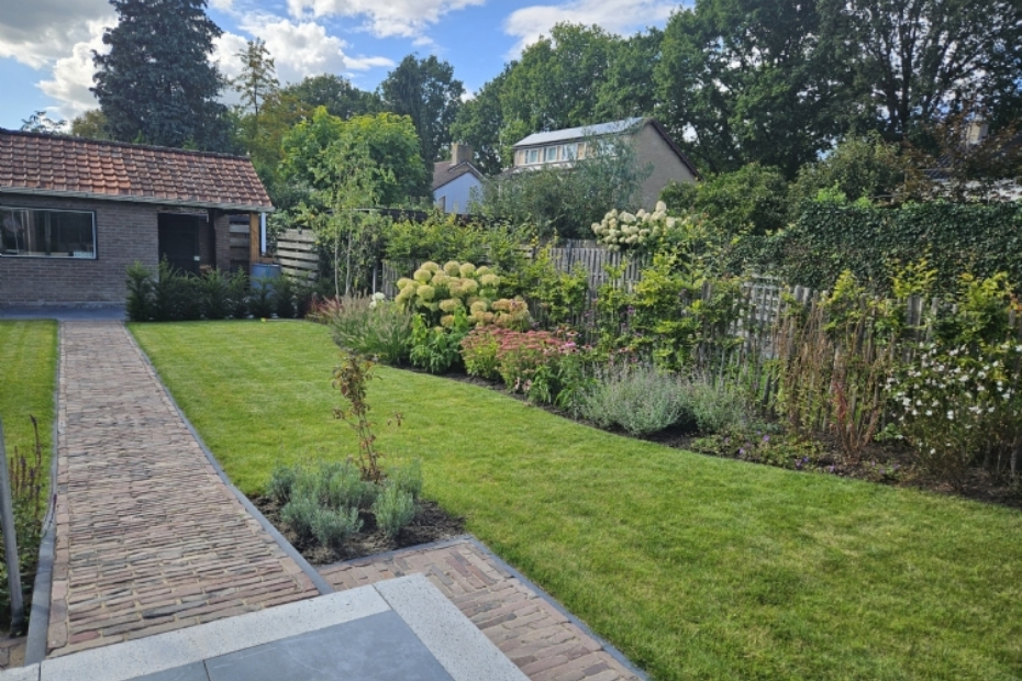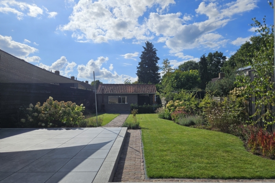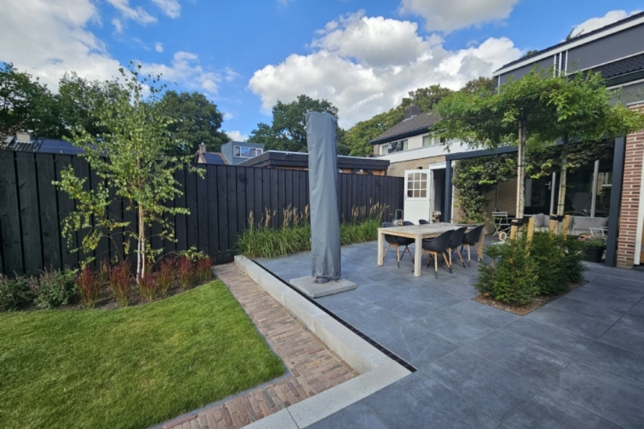 Naast gebruiksgemak speelde groen een belangrijke rol in het plan. De tuin is zo ingericht dat er een duidelijke balans is tussen verharding en beplanting. Daarbij is gekozen voor moderne materialen, gecombineerd met hergebruik van bestaande gebakken klinkers. Door deze opnieuw toe te passen, ontstond een samenhangend geheel waarin oud en nieuw op elkaar aansluiten.