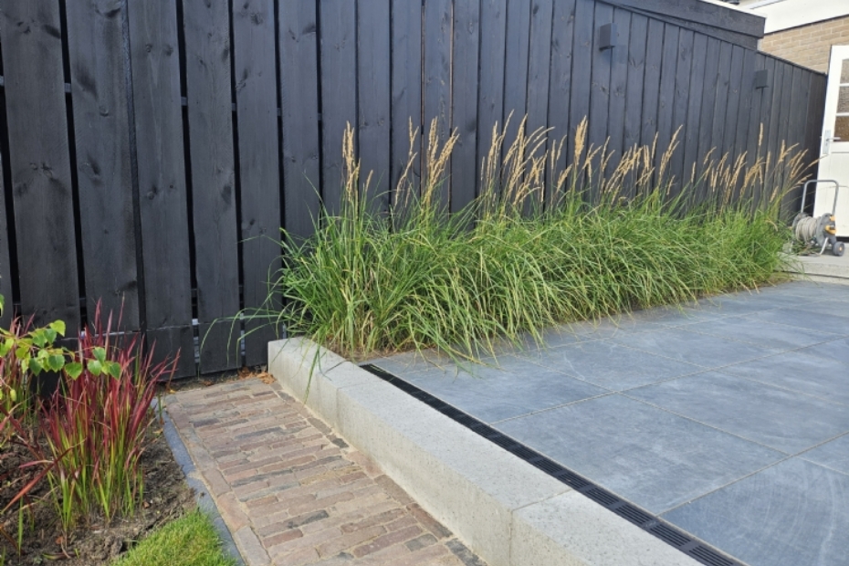 Structuur en seizoensbeleving Voor de verharding zijn onder meer keramische tegels van Ceramaxx (60x60x3 cm, Ardeche Carbon) verwerkt. Voor hoogteverschillen en accenten zijn stapelblokken en traptreden van Schellevis toegepast. In de beplanting is gekozen voor verschillende soorten, waaronder pluimhortensia's, die zorgen voor structuur en seizoensbeleving.