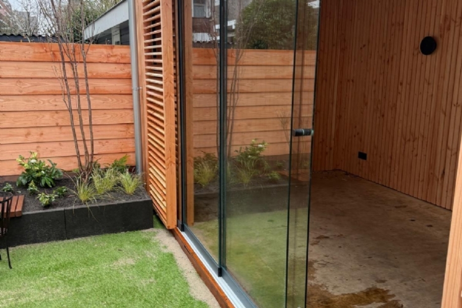 Verschillende materialen ingezet In de tuin is gewerkt met verschillende materialen. Er zijn keramische tegels toegepast in combinatie met een hardhouten vlonderpad en hardhouten zitbanken. Achter in de tuin staat een volledig geïsoleerde tuinkamer van douglashout. Deze is voorzien van vloer-, wand- en dakisolatie en afgewerkt met 10 mm glazen schuifwanden. Voor extra comfort zijn twee infraroodheaters van 1800 watt geplaatst. Het dak van de tuinkamer is uitgevoerd als sedumdak.