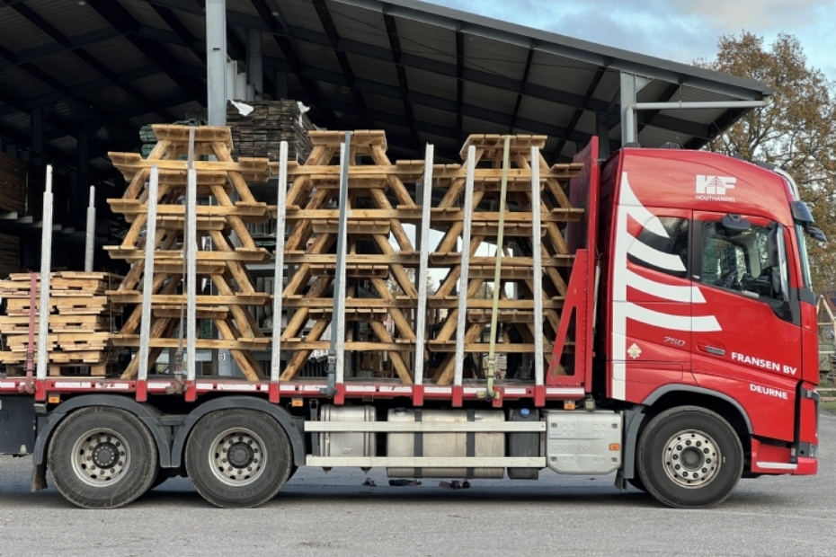 | | Een bijzonder gezicht: een vrachtwagen vol met handgemaakte picknicktafels van kastanje hout. |
