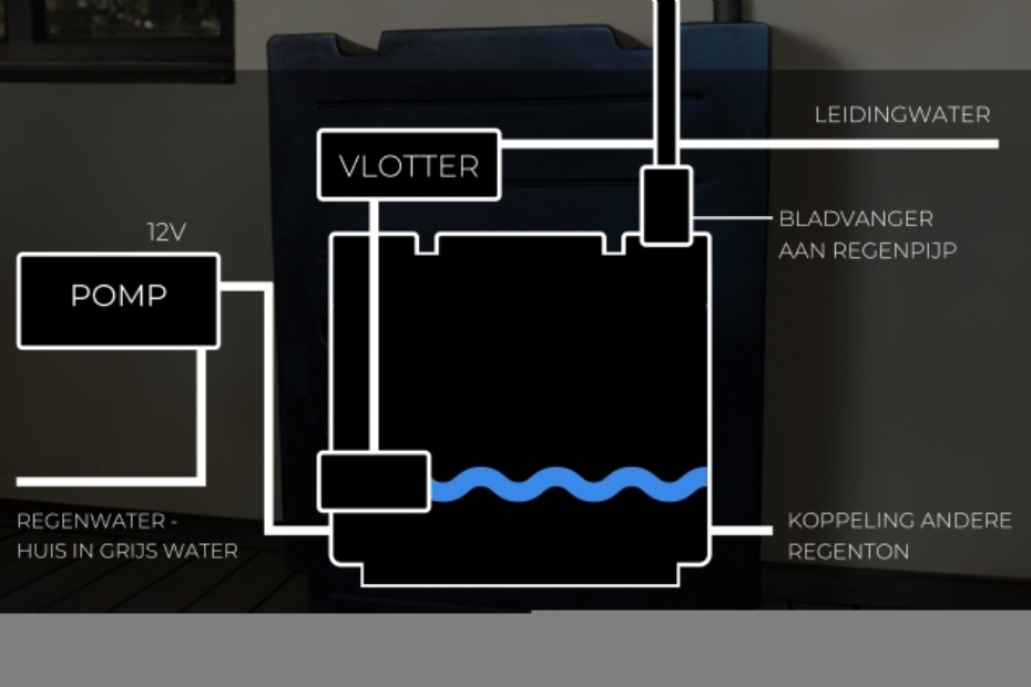 Gefilterd met bladvanger Technisch gezien wordt het regenwater via de regenpijp opgevangen en gefilterd met een bladvanger. Het opgeslagen water kan worden gebruikt voor tuinberegening. Dankzij een geïntegreerde pomp en vlotter is ook hergebruik als grijswater mogelijk. Wanneer meer opslag nodig is, kunnen meerdere tonnen aan elkaar worden gekoppeld.