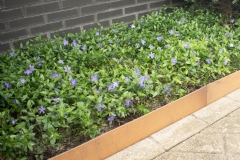 De bestrating bestaat uit een dubbele streklaag van gebakken waaltjes in antiek grijs, gecombineerd met organisch gevormde grindpaden en een gazon. Juist hier speelt Mevoline een sleutelrol. De cortenstalen Mevoline-randen van Amevo volgen alle rondingen in de tuin. 'Je kunt ze eenvoudig buigen en elke gewenste lijn maken,' zegt Soetendaal. 'Dat geeft veel vrijheid in het ontwerp.'