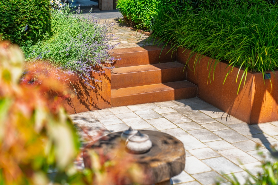 | | Hoogteverschillen kun je opvangen met verhoogde borderranden. Hier in een versie van cortenstaal van [LINK GIP 26716]Amevo[/LINK], ook verkrijgbaar in antraciet of rvs. |