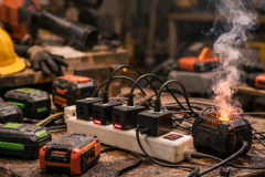 | Ongeordend laden van lithium-accu’s met meerdere laders op één stekkerdoos vergroot het risico op oververhitting en brand, vooral zonder toezicht (foto gemaakt met behulp van AI). |