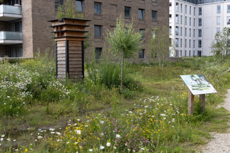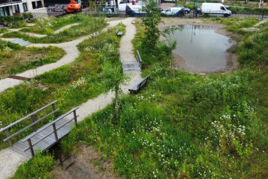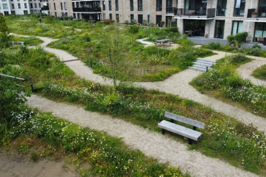 Klimaatadaptatie en biodiversiteit is hét thema van deze tuin. In de retentielaag van de daktuin wordt water opgeslagen en de wadi’s en beeklopen staan met elkaar in verbinding. Op deze manier is er een natuurlijk landschap gecreëerd die je kunt bewandelen via half verharde kronkelpaden. Er is geen afscheiding gemaakt tussen de terrassen van de bewoners wat het gevoel van een landschap, verbinding en beleving versterkt.