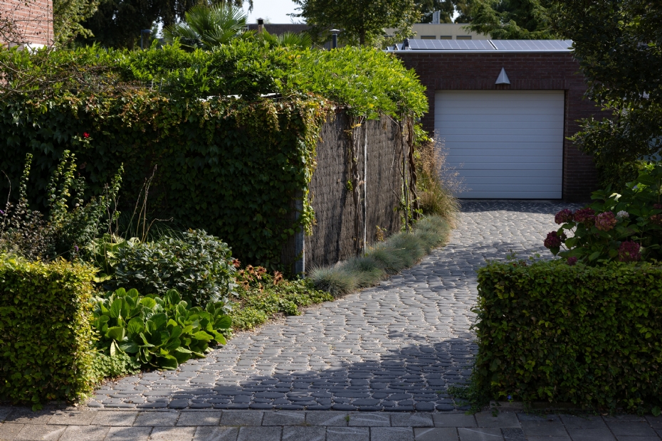 De Geosteen kasseistenen roepen het beeld op van oude Franse dorpspleinen en landweggetjes. Denk aan de kasseien die de wielerklassieker Parijs-Roubaix berucht maken. De 8-centimetervariant is waterpasserend, waardoor de nostalgische look goed samengaat met klimaatadaptatie. De stenen zijn sterk genoeg voor opritten en intensief gebruik, maar voelen door de gezandstraalde afwerking toch zacht en prettig aan. Spijker legt uit: 'Voor een oprit met kasseien leg je eerst een stabiele, waterdoorlatende fundering van 15-20 cm. Daarop komt een straatlaag van 3-5 cm, waarna je de kasseien in een lineair of rustiek wildverband plaatst. Ten slotte vul je de voegen met wit zand of een geschikt voegmiddel dat je zachtjes insproeit zodat het zich kan zetten.'