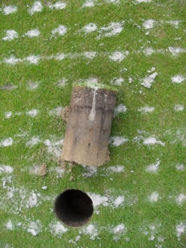 Hein Vader: 'Zeker! De greens zijn zichtbaar beter geworden en toplaag is duidelijk verbeterd.' Hoofdgreenkeeper Wim Oskam: 'Bij het 'hole steken' zijn de zandpilaren van voorgaande jaren nog steeds zichtbaar.'