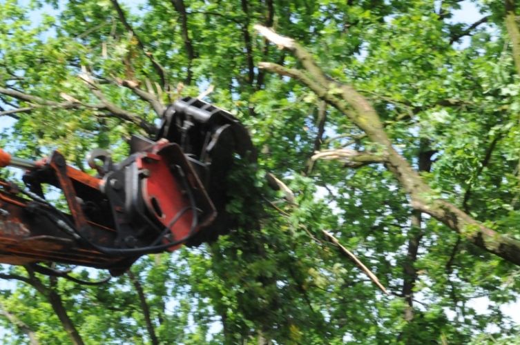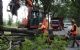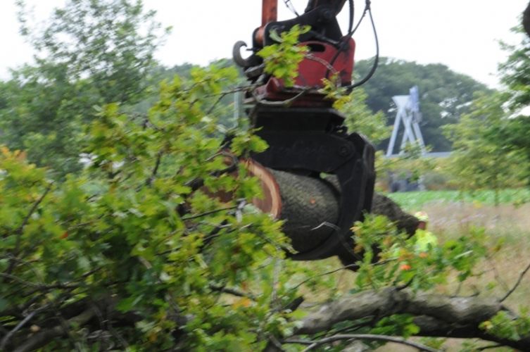 7) Met de bomenklem worden een paar beschadigde takken van bomen die mogen blijven staan weggehaald.