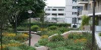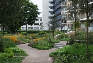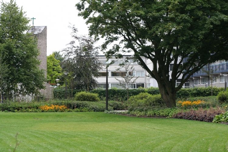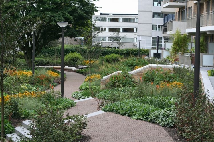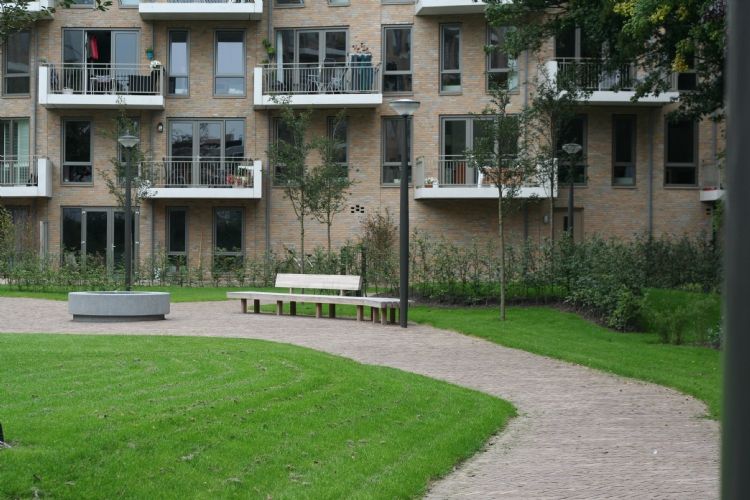 De L-vorm van dit nieuwbouwcomplex, maakt dat de openbare tuin aan de achterzijde een beschutte, introverte ruimte wordt. Het vloerpeil van de woningen ligt 1,80 meter boven tuinniveau. Door een zone van bloemensawa's en lage brede hagen te maken, wordt het hoogteverschil trapsgewijs opgevangen. Het hagenpatroon reageert op de geknikte vorm van de gevel. Wandelpaden en trappen leiden tussen bloemen door naar de centrale open ruimte met een terras rondom een fontein, een natuurspeelplaats voor de allerkleinsten en een groot grasveld voor gezamenlijk gebruik. De bloemenborders zijn beplant volgens het beplantingsconcept "Zorgeloos-Groen", uitbundig bloeiende, jaarrond kleurige beplanting die onderhoudsarm is.