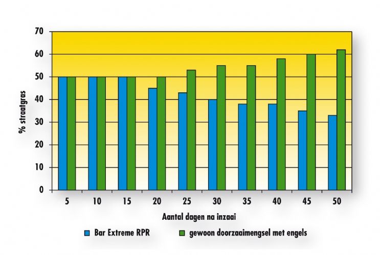 Straatgras, de nachtmerrie van elke greenkeeper. Door de snelle kieming is straatgras erg hardnekkig. RPR vormt door haar uitlopers een zeer dichte grasmat. Straatgras wordt als het ware weggedrukt. De combinatie van stevigheid en snelheid zorgt ervoor dat RPR de strijd aangaat met straatgras. Dit resulteert in een dichte, beter wortelende grasmat die minder mest en water nodig heeft. Proeven hebben aangetoond dat gebruik van het nieuwe mengsel Bar Extreme RPR de straatgrasdruk met 20% kan doen afnemen binnen 2 maanden na inzaai. Doordat RPR al zo vroeg ingezaaid kan worden heeft u langer profijt van een groene grasmat, die het jaarrond gesloten blijft.