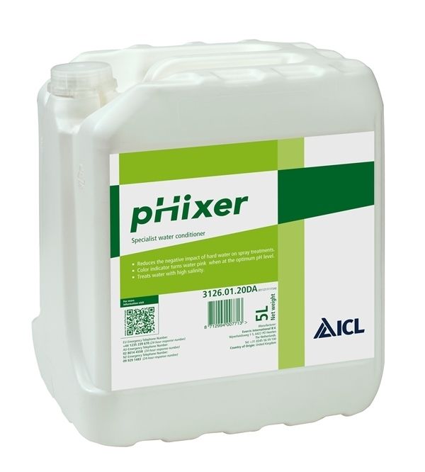 Dit laatste product is een goedje dat je aan de spuitvloeistof toevoegt, zodat deze exact de juiste pH (tussen 4 en 5) krijgt. Dit zou zorgen voor een betere werking van fungiciden en herbiciden. Het idee is simpel: je mengt pHixer in de veldspuit en op het moment dat de spuitvloeistof roze verkleurt, heb je de juiste pH te pakken.