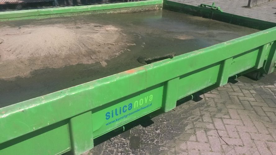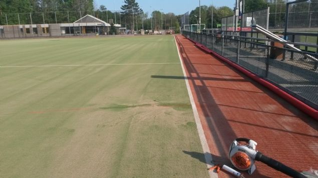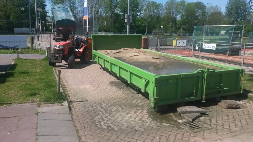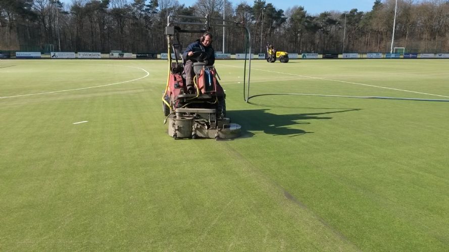 Het veld is diverse malen gereinigd door diverse aannemers waarbij het probleem elke keer in afzienbare tijd terug kwam. Het veld is door het vele reiniging veel zand verloren. In samenwerking met Ton de Rooij is een techniek ontwikkeld waarbij het vuil tot op de backing word verwijderd d.m.v. hoge waterdruk en direct in een naast het veld staande container wordt gepompt. Het overtollige water vloeit af uit de container en de algen en zand bezinkt in de container.