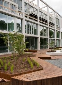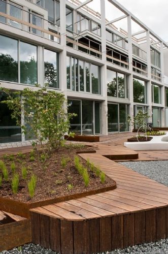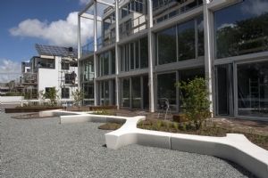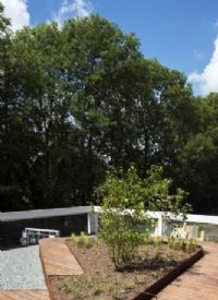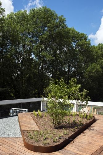Bijzondere details De gezamenlijk daktuin, die half juni klaar is, krijgt een aantal bijzondere blikvangers, zoals de grote Twig-zitelementen en het cortenstaal waarmee de beplanting omlijst wordt. Het dak heeft een afwerking van split en vlonders van bamboe, een duurzaam en milieuvriendelijk alternatief voor de gebruikelijke hardhouten vlonders. Het resultaat is een daktuin op niveau met een luxe uitstraling en een duurzame inrichting. Ook de vlonder aan de waterkant is uitgevoerd met bamboe.