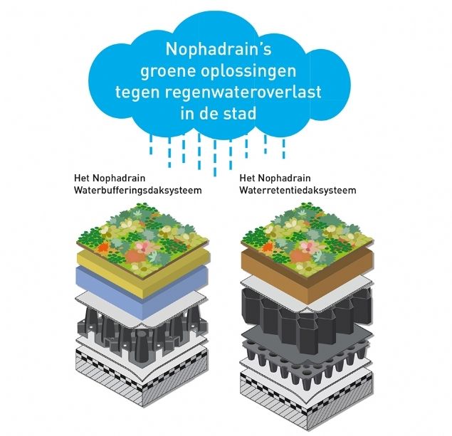 Waterbuffering en waterretentie Speciale aandacht zal tijdens de Dag van de Openbare Ruimte uitgaan naar de nieuwe Nophadrain Waterbufferings- en Waterretentiedaksystemen. Hiermee biedt Nophadrain een oplossing tegen de toenemende regenwateroverlast in stedelijke gebieden, die veroorzaakt wordt door de steeds vaker voorkomende heftige regenbuien.