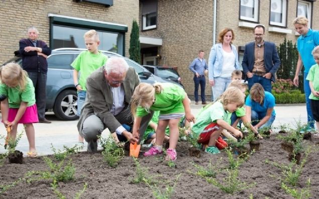 Samen met kinderen opent wethouder Ben Aldewereld de rotonde