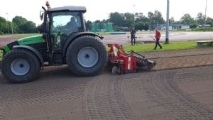 Gisteren is men gestart met het mengen van de Lava Oxygen in de toplaag. Peter Laan van DCM vertelt: 'Op de bestaande toplaag is vijf centimeter Lava Oxygen aangebracht die met een frees wordt doorgemengd in de bovenste twintig centimeter. Het is belangrijk dat bij de menging de Lava Oxygen gelijkmatig en homogeen wordt gemengd met de toplaag.'