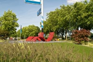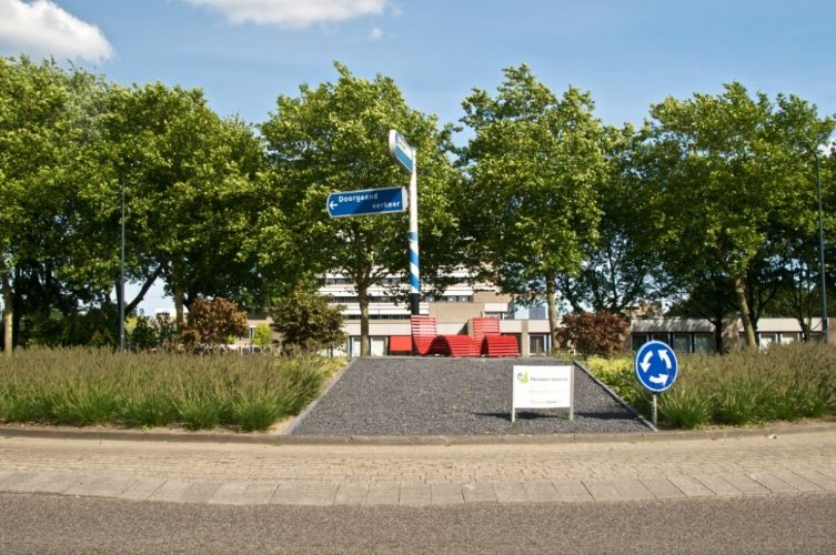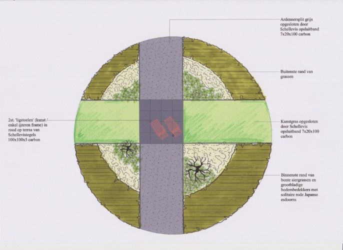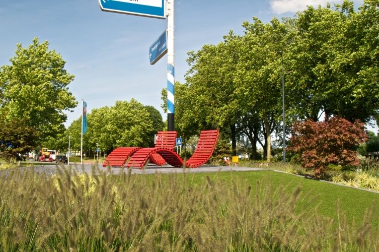 Mark Vlasman van Florissant Tuinen: 'Toen ik begon, wilde ik een rotonde ontwerpen, maar wij maken eigenlijk tuinen. Dus beschouwde ik de rotonde als een tuin, ook om ons bedrijf te etaleren en te laten zien wat we doen: tuinen ontwerpen en realiseren. Met wat hogere grassen als haag buitenom werd min of meer een besloten ruimte op de rotonde gecreëerd. Het terras, compleet met stoelen, laat zien dat het een tuin kan zijn. Banen kunstgras verlengen de aanwezige grasstroken buiten de rotonde, zoals de banen split de rijbaan verlengen.'