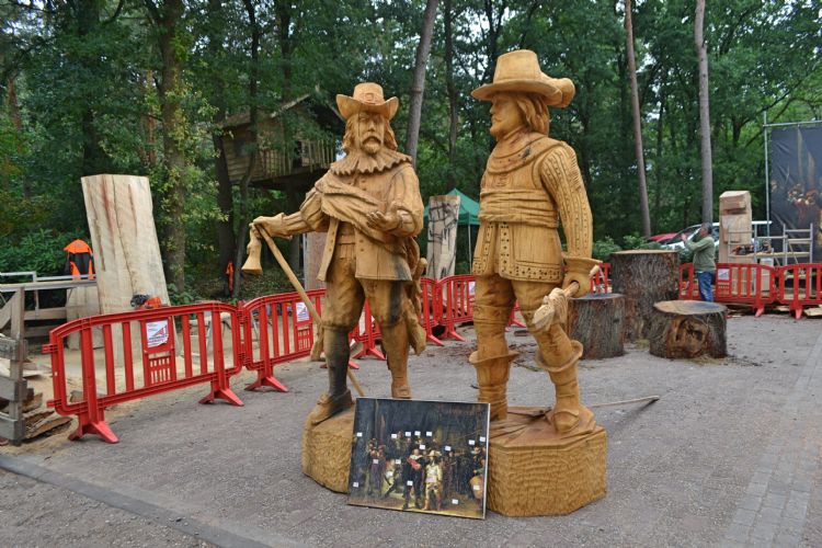 Voor de start is de groep afgereisd naar het Rembrandtplein in Amsterdam. Daar staat de Nachtwacht als bronzen beeldengroep: perfect om als inspiratiebron voor de houten versie te gebruiken. 'Van een schilderij kun je niet alles afleiden. Daarom zijn we naar de Nachtwacht op het Rembrandtplein gaan kijken. De foto's die we hebben gemaakt, doen dienst als inspiratie. We werken met stokken om alles op te meten en de goede verhoudingen aan te houden. 95 procent wordt met de kettingzaag gedaan; alleen de kleinste details werken we bij met een beiteltje.' De carvers zijn in juli vier dagen net buiten het terrein van het Zandsculpturenfestijn bezig geweest, maar het totale kunstwerk is in die tijd niet afgerond. Daarom zal de groep later nogmaals bij elkaar komen om de klus af te maken.