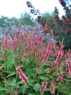 Persicaria amplexicaulis 'Lisan' 'Deze laatbloeier is een lagere selectie van Persicaria amplexicaulis, is supersterk en heeft een grote aantrekkingskracht op bijen en vlinders.'